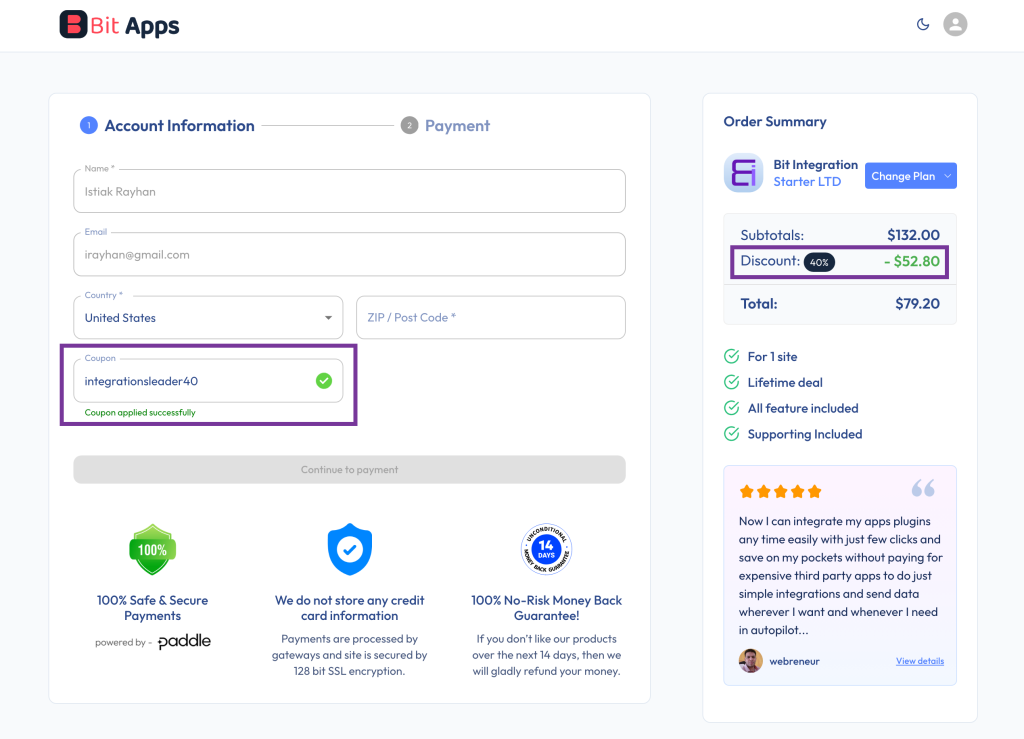 Provide your billing information and complete the purchase. You’ll get immediate access to Bit Integrations with the update period specified by your chosen plan.